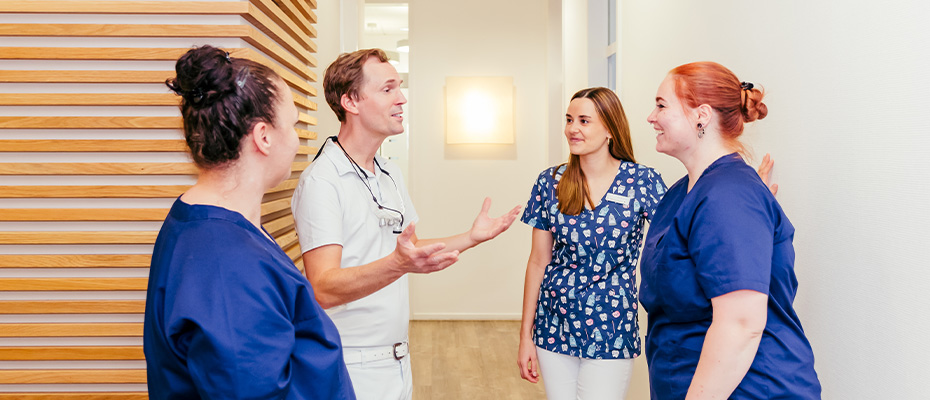 - Teamarbeit: Gemeinsam arbeiten wir Hand in Hand für einen reibungslosen Ablauf in der Behandlung und der Organisation. Wartezeiten werden kurz gehalten und wir unterstützen Sie in der Kommunikation mit Ihrer Krankenkasse.